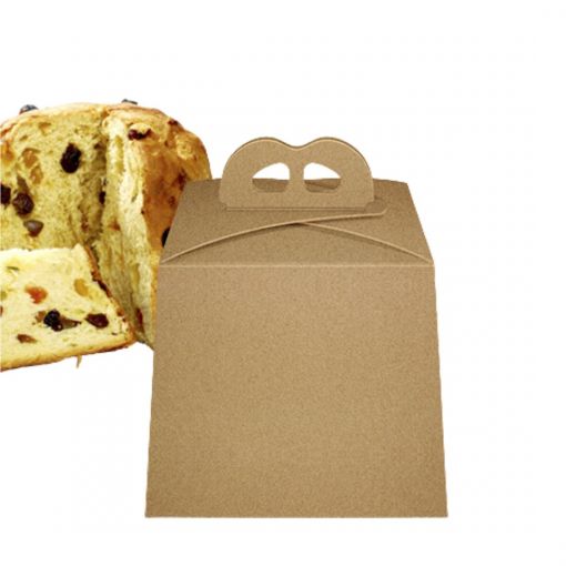 La caja para panettone de medidas 16,5x16,5x15,5 cm en kraft con asa es una solución ideal para empaquetar y transportar este delicioso postre navideño.